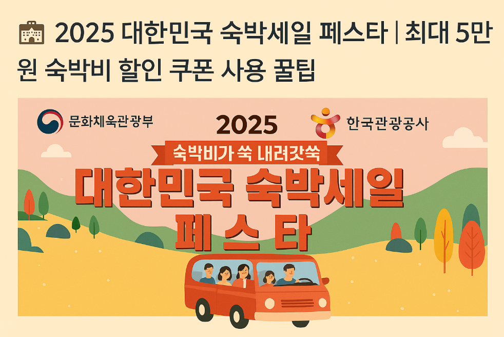 ‘2025 대한민국 숙박세일 페스타’로 최대 5만 원 숙박비 할인 찬스! 비수도권과 특별재난지역 대상 숙박비 부담 덜어주는 기회, 놓치지 마세요. 이 글 하나로 신청 기간부터 꿀팁까지 한눈에 정리해 드립니다.