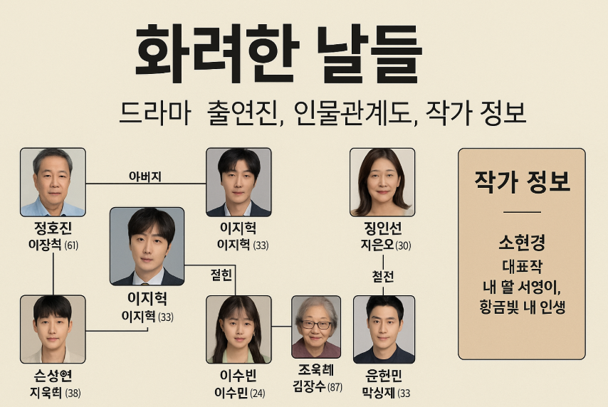 주말 안방을 사로잡을 KBS2 화려한 날들 정보를 한 번에! 방송 기본 정보부터 주요 캐릭터, 인물관계도(요약), 작가·제작진, 시청 가이드까지 보기 쉽게 정리했습니다.
